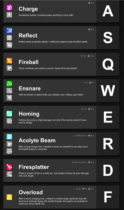 Teclas ASQWERDF para atacar e se defender com feitiços